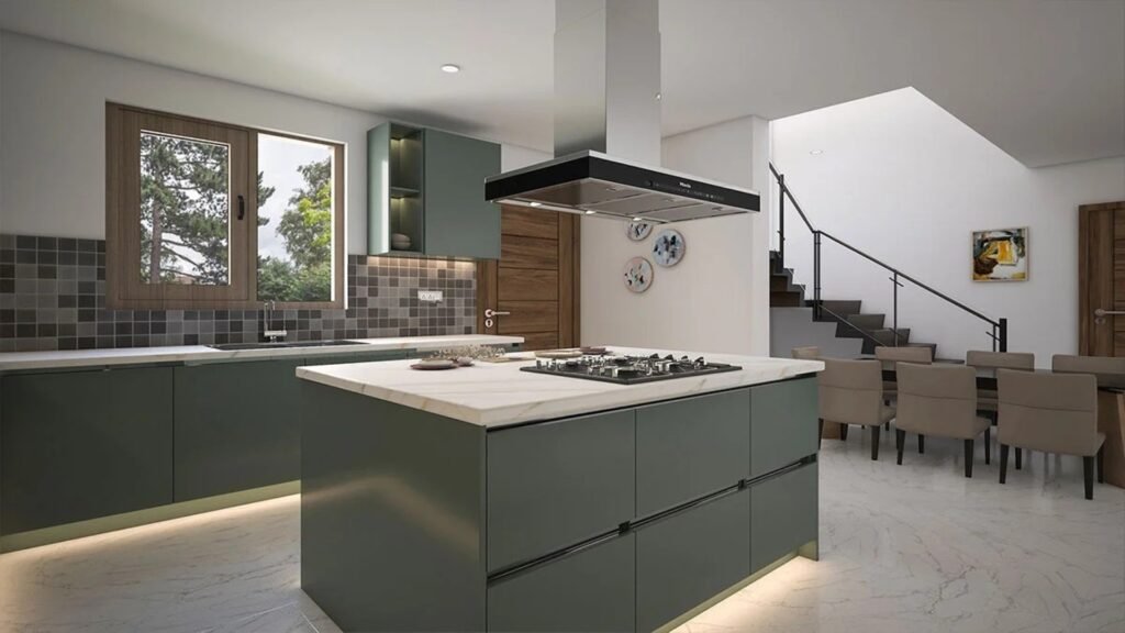 At MD Interiors & Decorators, we design luxurious island modular kitchens that blend beauty, functionality, and comfort. The island kitchen layout adds a modern touch while offering extra space for dining, storage, and cooking — perfect for today’s elegant homes.